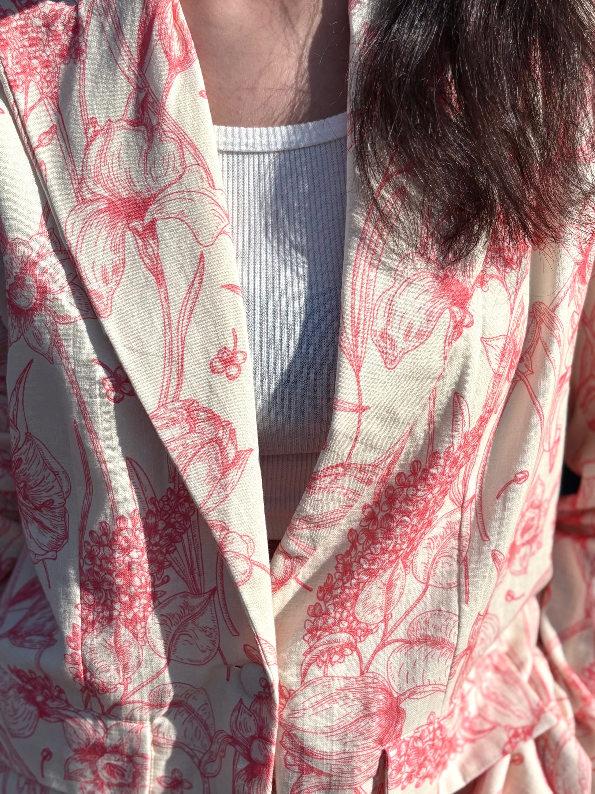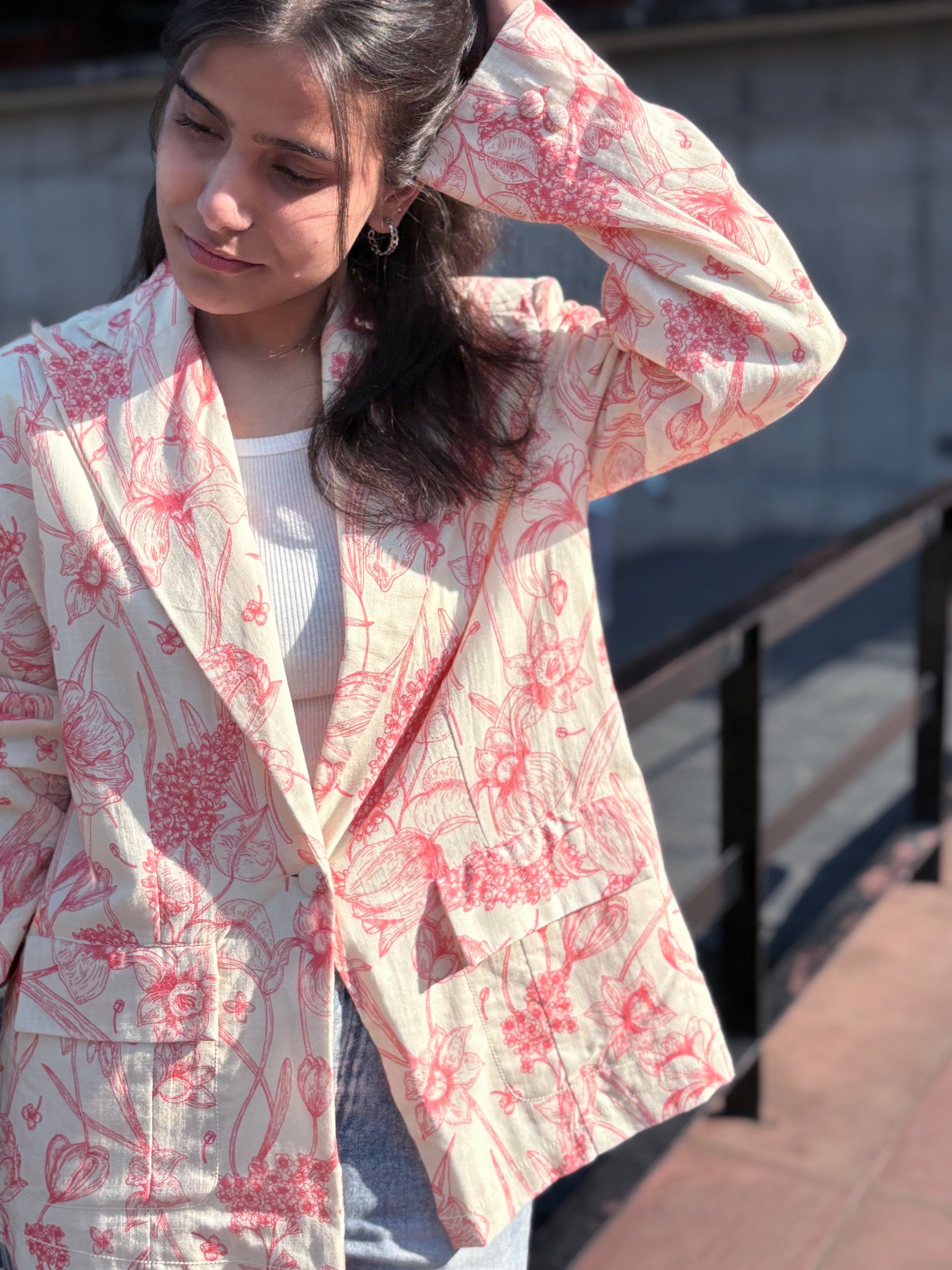Our Toile de Jouy Blazer is a refined wardrobe essential, crafted from breathable cotton slub with a soft mulmul lining. Designed for effortless elegance, the blazer balances comfort with structured tailoring, making it ideal for versatile day-to-evening wear.